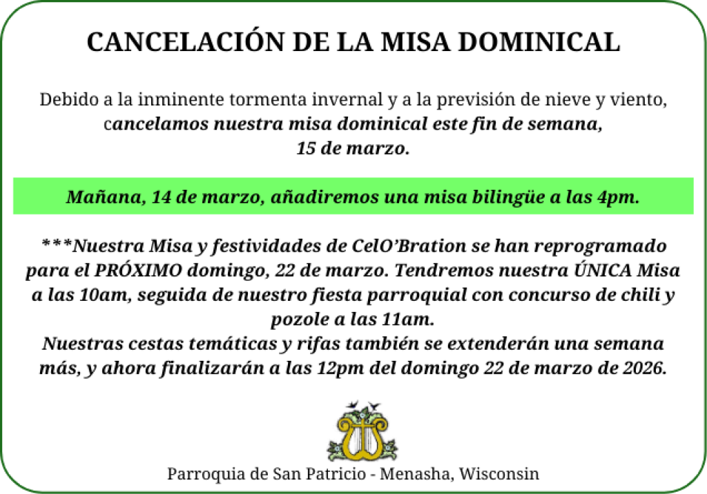 One Sunday Mass on Sunday, March 15: 10am